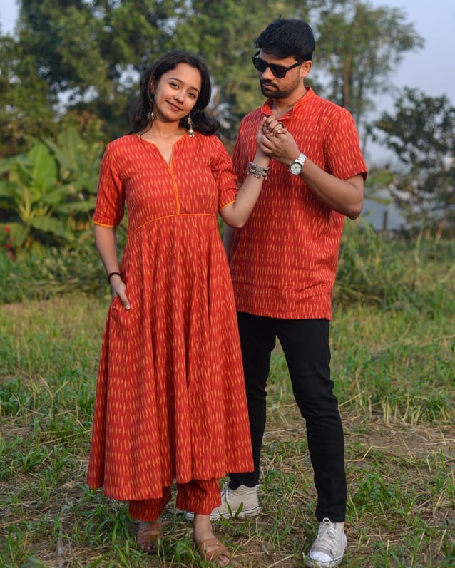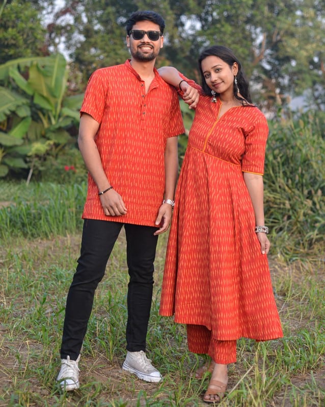 This Canary Red Anarkali Couple Set is the perfect way to make a statement at any special occasion. The set includes beautiful anarkali suit, The anarkali is a stunning red color with V-neck and sleeves detailing. The Men short kurta have red color with a mandarin collar. Both men kurta and women dress are made from high-quality fabrics and feature intricate detailing that will make you stand out from the crowd. This set is perfect for any wedding, engagement, or special occasion and will make you look and feel like royalty.