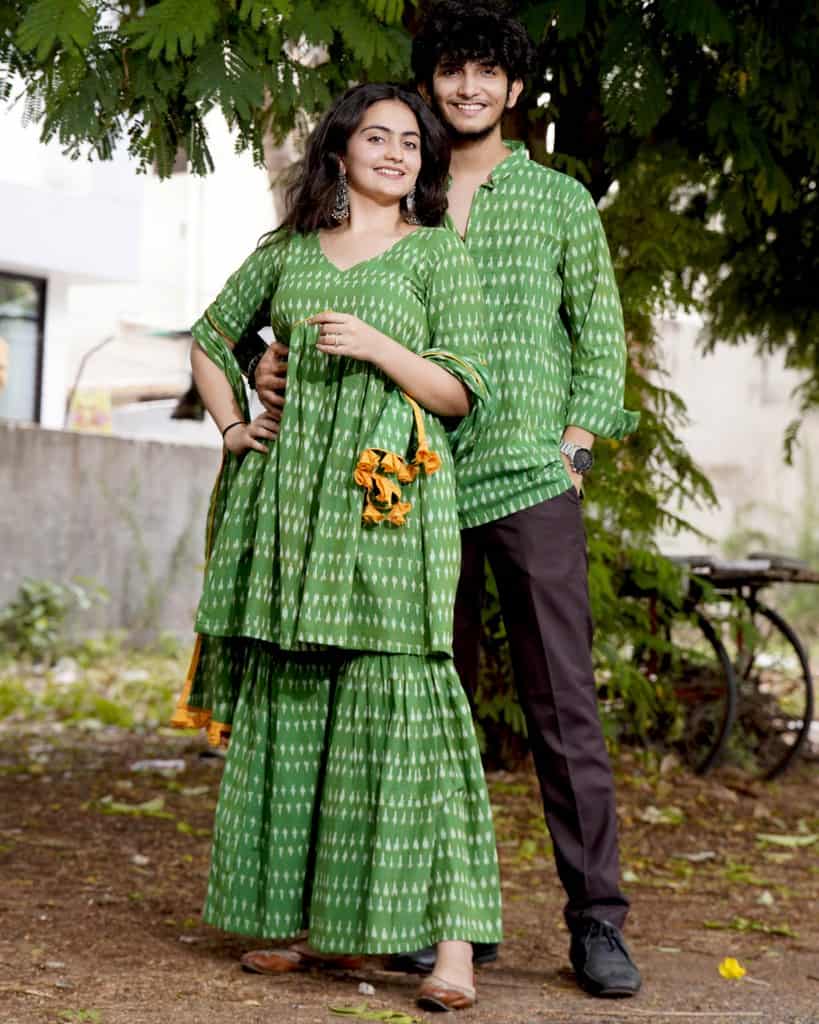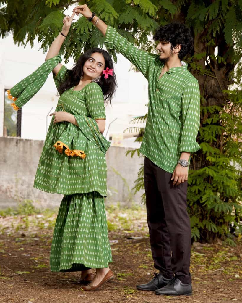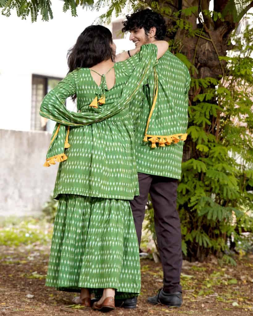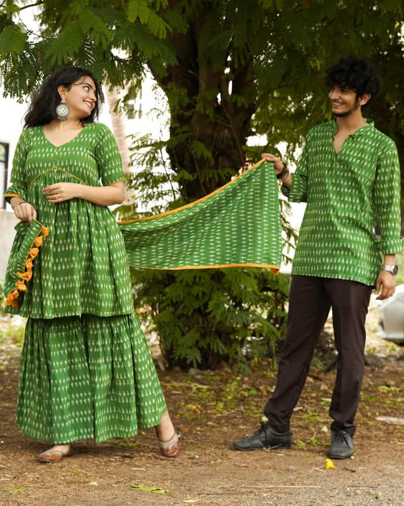 This Green Ikat Sharara Couple Set is the perfect way to make a statement at any special occasion. The set includes a beautiful green ikat sharara with dupatta for the women and a matching green ikat short kurta for the men. The sharara is made from a lightweight woven ikat cotton fabric. The kurta is made from a soft cotton fabric and features a classic mandarin collar and a full-length sleeves. Both pieces are finished with a subtle musturd yellow detailings for a touch of elegance. This set is perfect for a traditional Indian wedding or any other special occasion. It is sure to make a lasting impression and will be cherished for years to come.