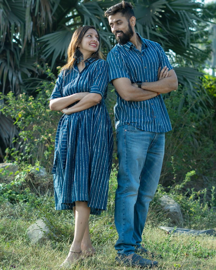 Come closer to your significant other this fall with the indigo striped couple twinning collection. Be it a day out or a date night, with the amount of comfort this collection has to give out, it works for you anywhere. Look fabulous with your loved one by upgrading to our latest collection today! Female’s dress comes with its fabric belt.