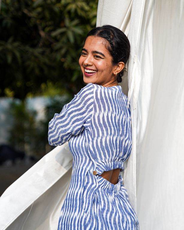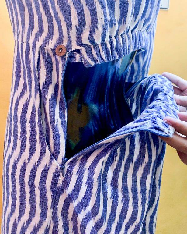 How to go to public washroom and get all naked to just pee, Presenting our unique concept of pee friendly jumpsuit. Just open side zippers on both sides of your hips, drop the back flap down, squat, pee, zip and button them up and done. Washroom is just a zipper away. Pure Cotton fabric. Side pockets. Back waist elastic. The Length of the Jumpsuit is 55″