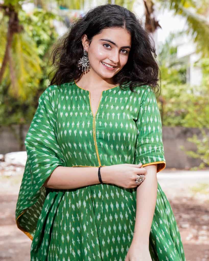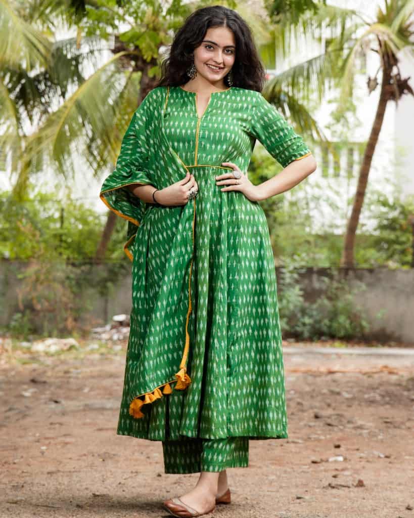 This Green Ikat Anarkali Set is the perfect choice for any special occasion. The set includes a beautiful green ikat anarkali kurta and a matching palazzo. The kurta is made from a lightweight cotton fabric and features a round – v neckline, elbow length sleeves, and a flared silhouette. The pattern is done in a traditional ikat pattern and is highlighted with gold thread. The palazzo is made from a soft cotton fabric and features an elasticated waistband for a comfortable fit. The set is perfect for any festive occasion and will make you look and feel beautiful.