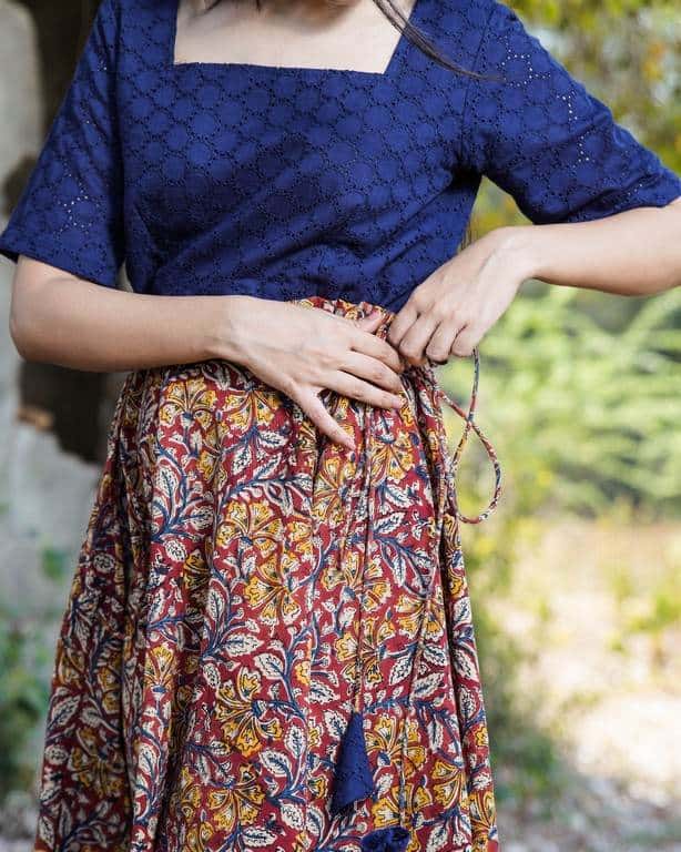 We use traditional natural dyes and vegetable prints, so colour might rub dry initially and bleed in first wash (few washes). Preferably Dry Clean else hand wash can also be done. Please do not soak and always dry inside out in sun.