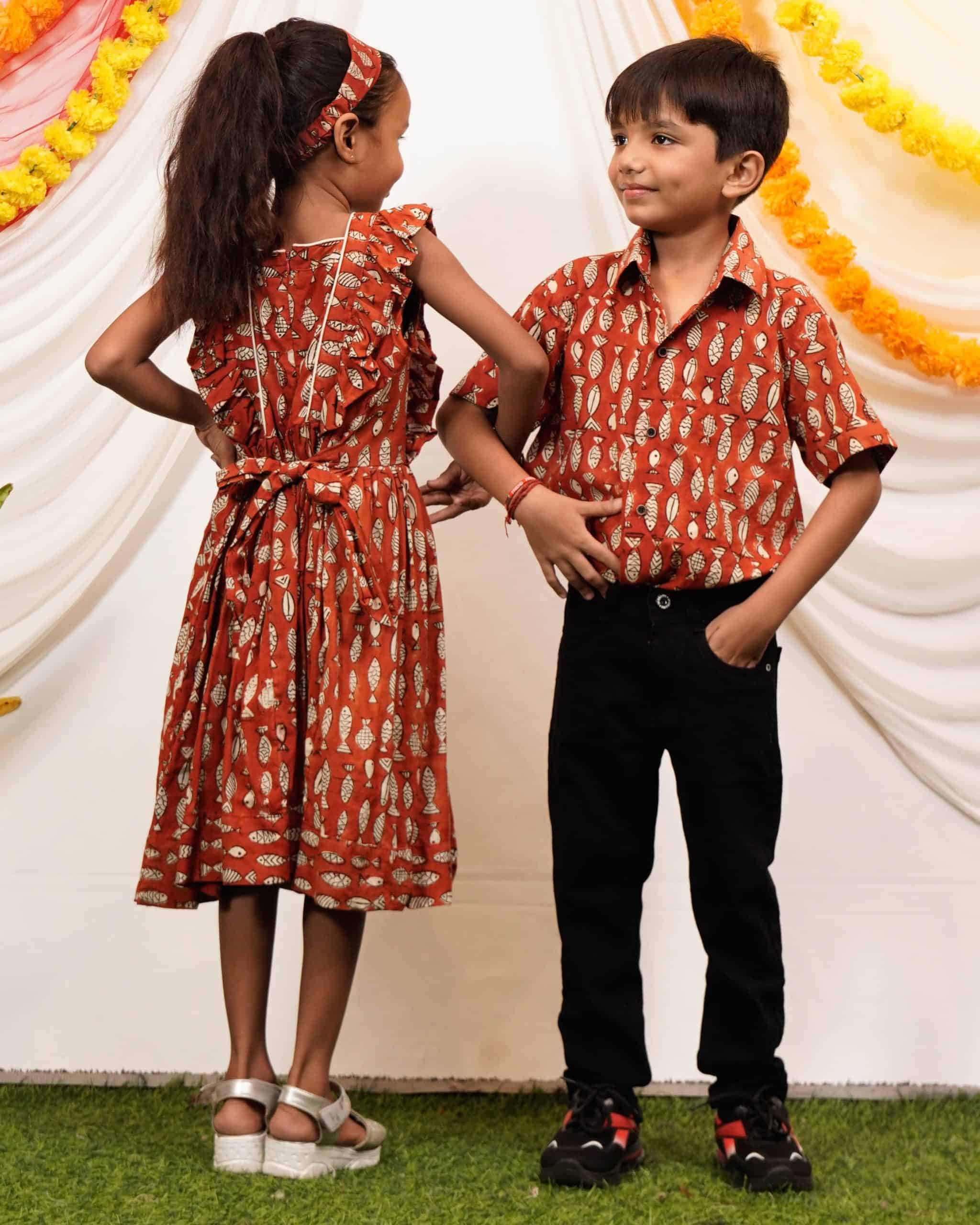 The Fish Red Print Short Family Set is a comfortable, stylish and office wear way to elevate your wardrobe. The cotton fabric is just soft and comfortable. The set comprises a short dress with bell sleeves for the female, and for male’s shirt we have regular collar with half sleeves and a dress for the kids. The family set can be customized as per your needs and requirements. These outfits are sure to brighten up any dull day!