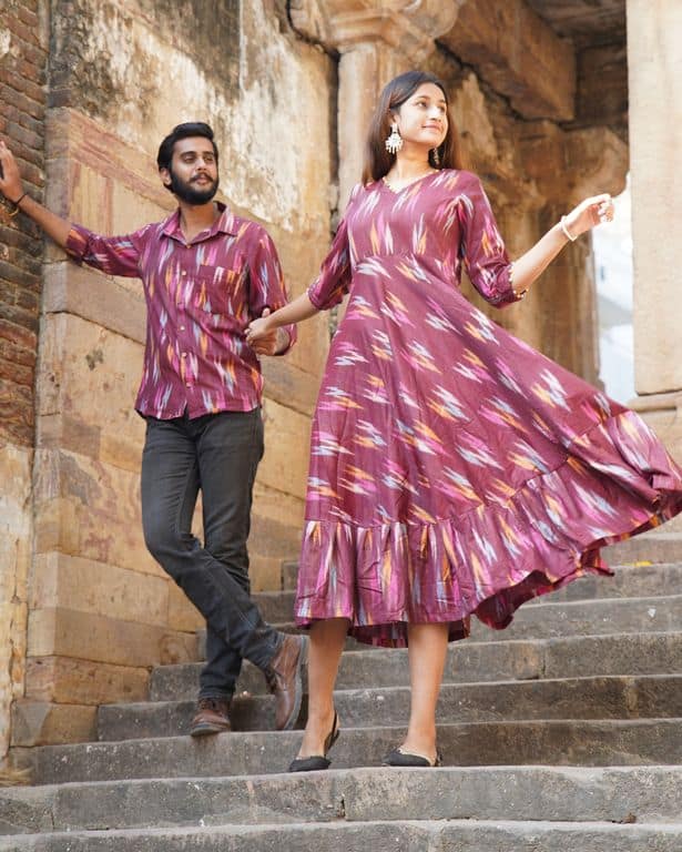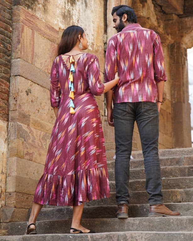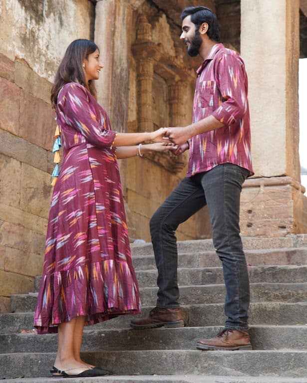 The Maroon Panache Family set is a coordinating outfit for a couple, featuring a maroon color palette. The coordinating design of the set will make the couple stand out and look stylish together. The set is made with quality materials and is sure to be a cherished keepsake for the couple. For female’s dress, it has a stylish V neck and tassels on the back to make it an amazing outfit. For male’s shirt, it has regular collar and full sleeves to give it an amazing look. Kids outfit can be customized as per your needs.