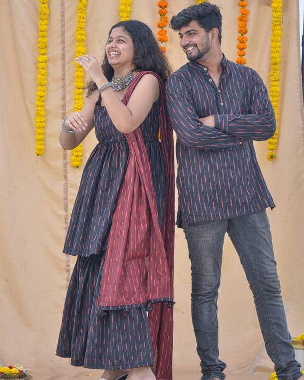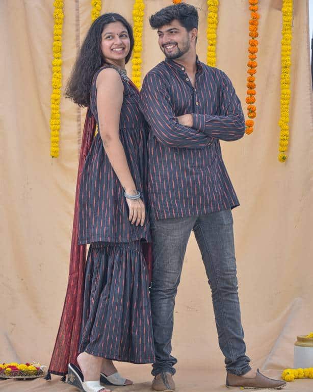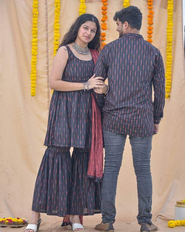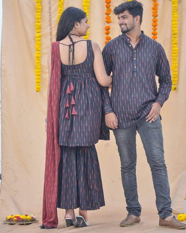 Don’t want more to go for jezzy neither want very simple for this Diwali ? Raven Black Sharara Family set is here for you guys. This bright colour is perfect for festival evening carrying along fashion and comfort with you.Grab your hands on this beautiful sleevless outfit with round neck and a matching Men kurta looks amazing.