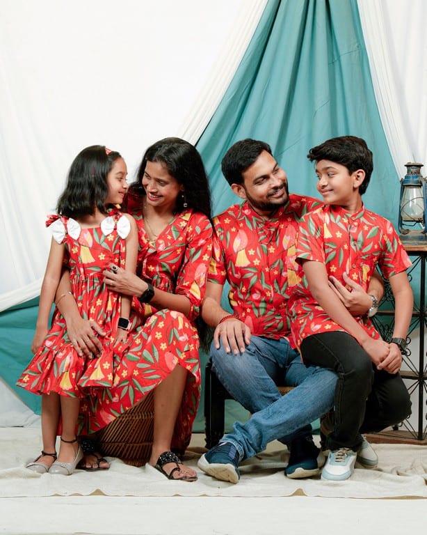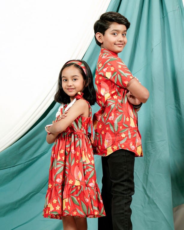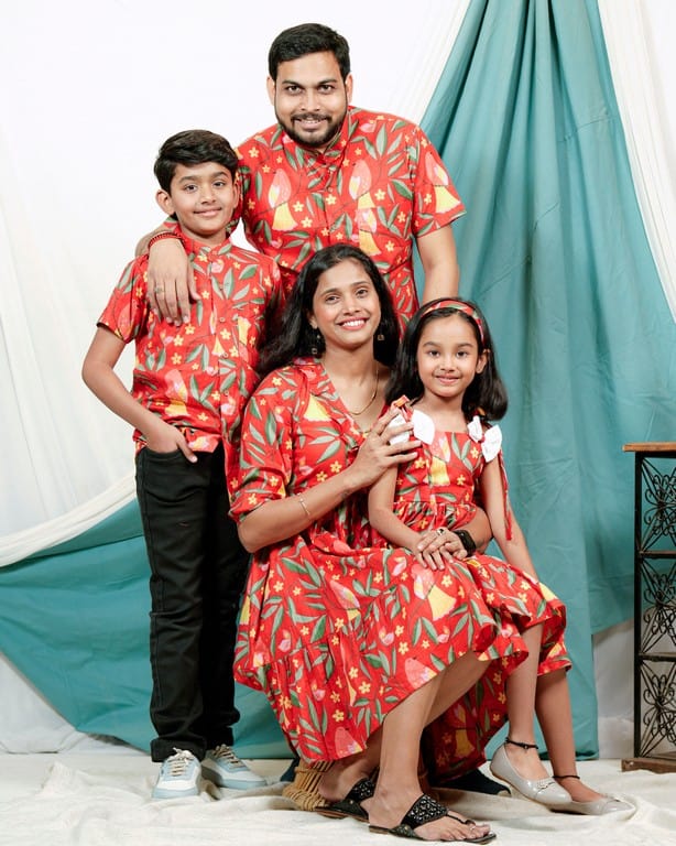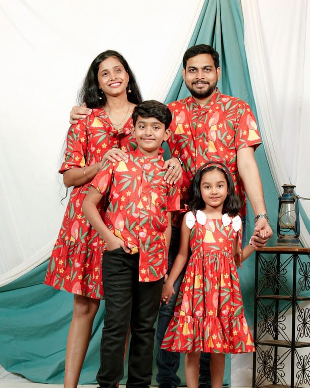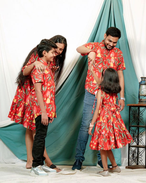 This Red Bird Short Family Set is a stylish and coordinated ensemble that’s perfect for families who want to show off their fashion sense. The set features an all-over floral print in shades of pink ,yellow and green on a white background, creating a bold and eye-catching look. The fabric is made from a high-quality blend of cotton, making it soft, comfortable, and easy to care for. Female’s dress has a beautiful V neck with frill to give it a stylish look and male’s shirt has chinese collar with half sleeves. Kids outfit can be customized as per your needs!!
