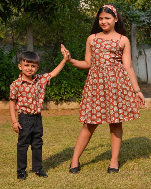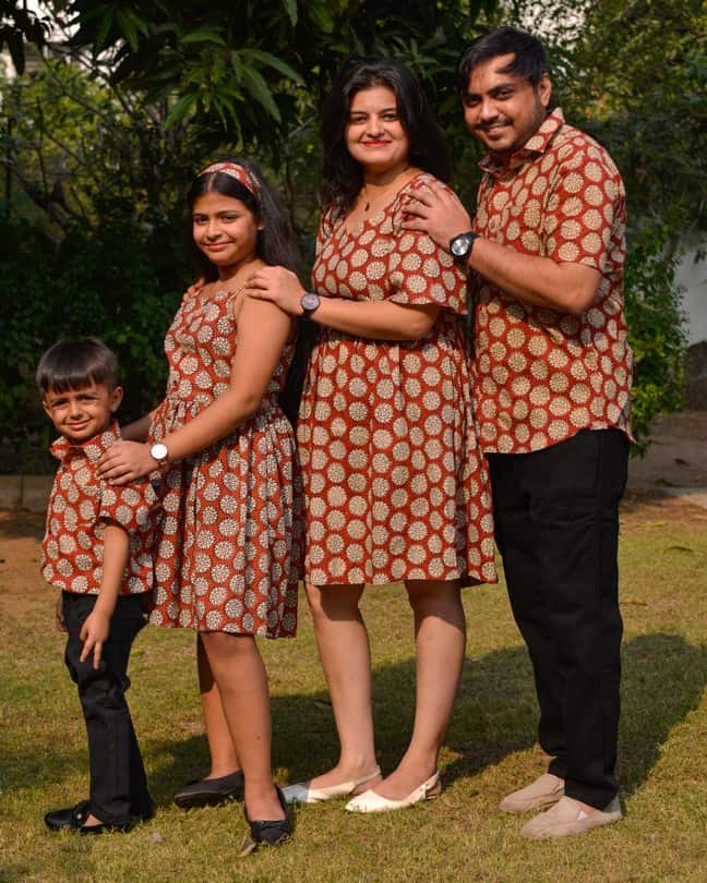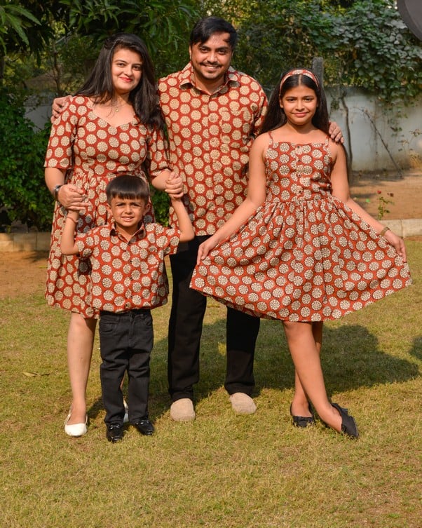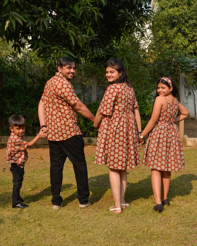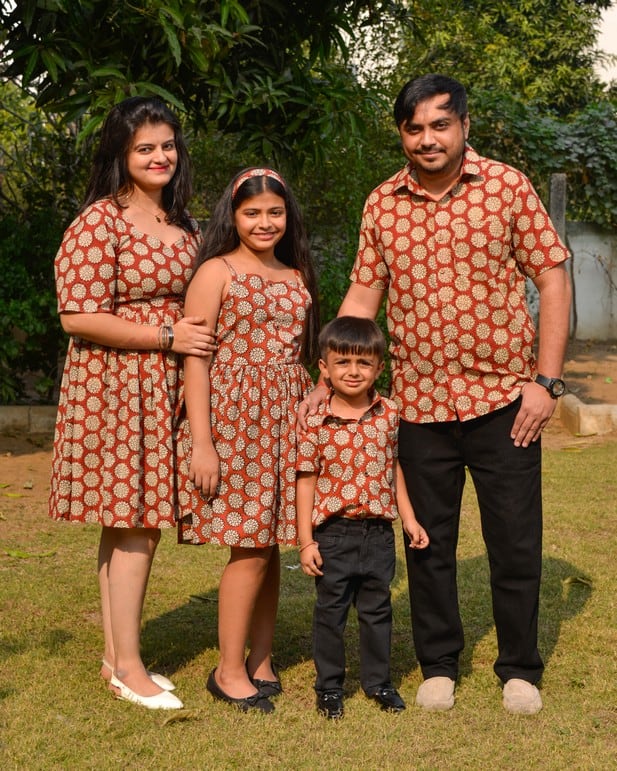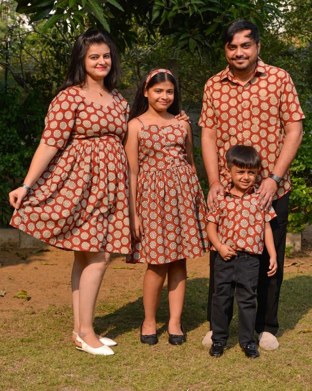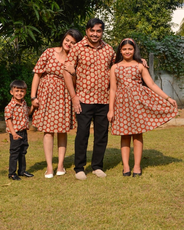 The Rosy Vine Family Set is a comfortable, stylish and office wear way to elevate your wardrobe. The cotton fabric is just soft and comfortable. The set comprises a short dress with bell sleeves for the female, and for male’s shirt we have regular collar with full sleeves and a dress for the kids. The family set can be customized as per your needs and requirements. These outfits are sure to brighten up any dull day!