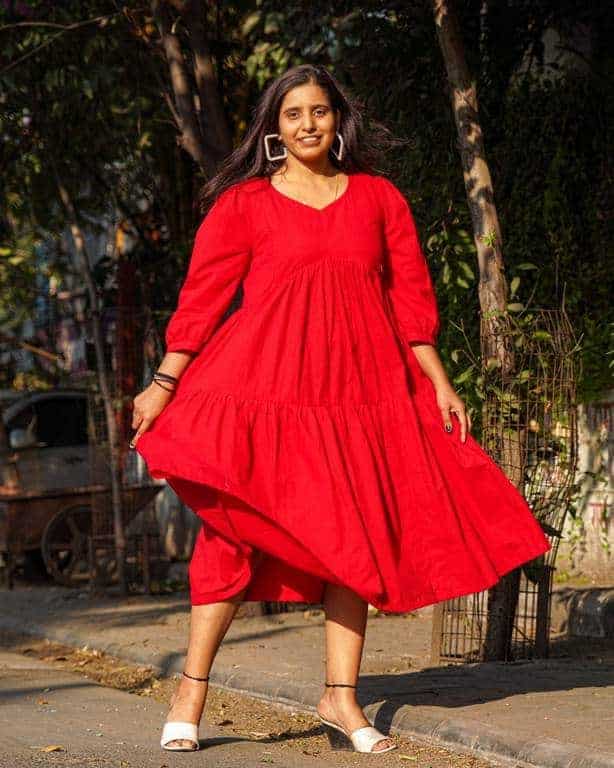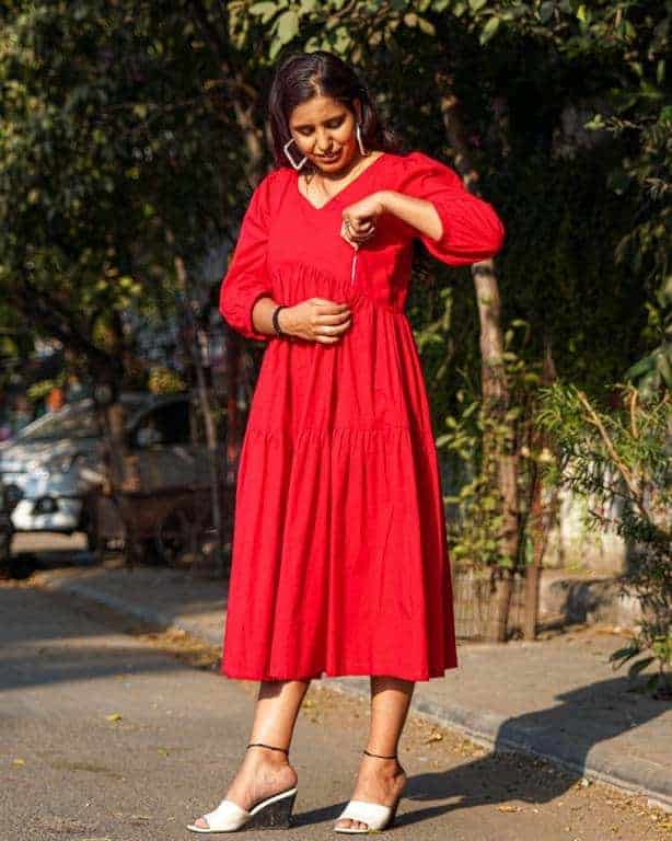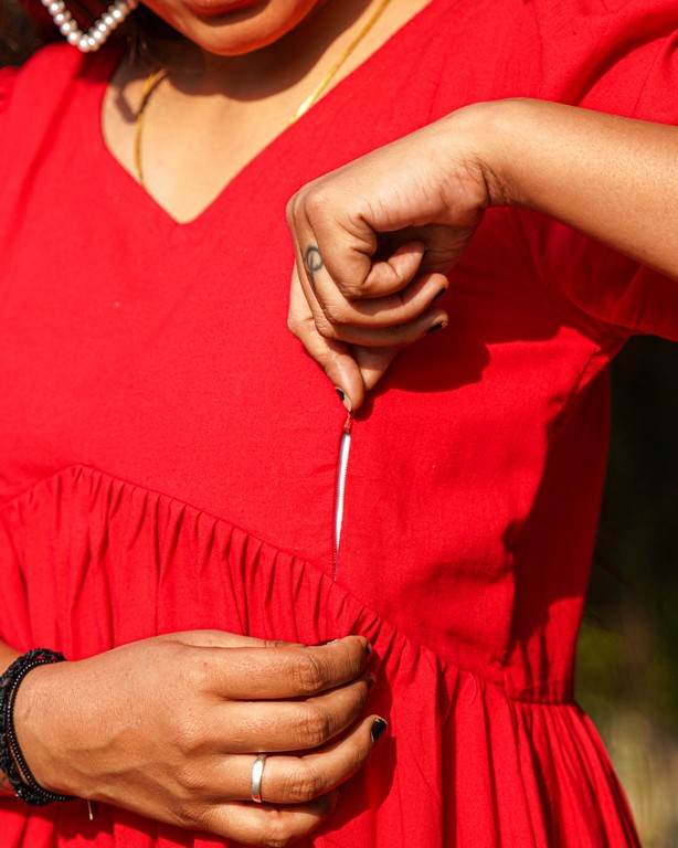Hey!! This is a season to sparkle yourself by wearing our Cherry Red Tiered Nursing Dress which comes with a concealed zipper for your own comfort. The dress comes with a great flowy frill with sweetheart neckline and elegant puffy sleeve. It adds an Indo-western vibe to your wardrobe. Grab our Cherry Red Tiered Nursing Dress now!